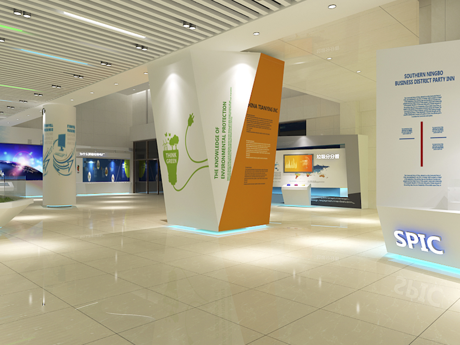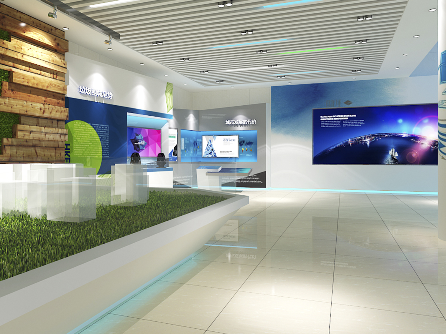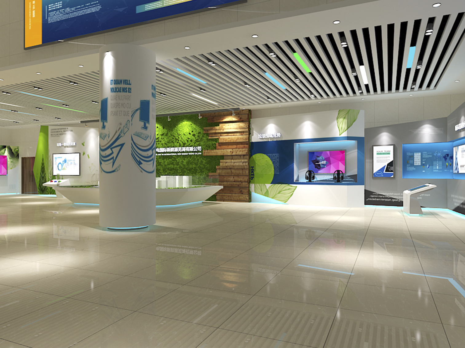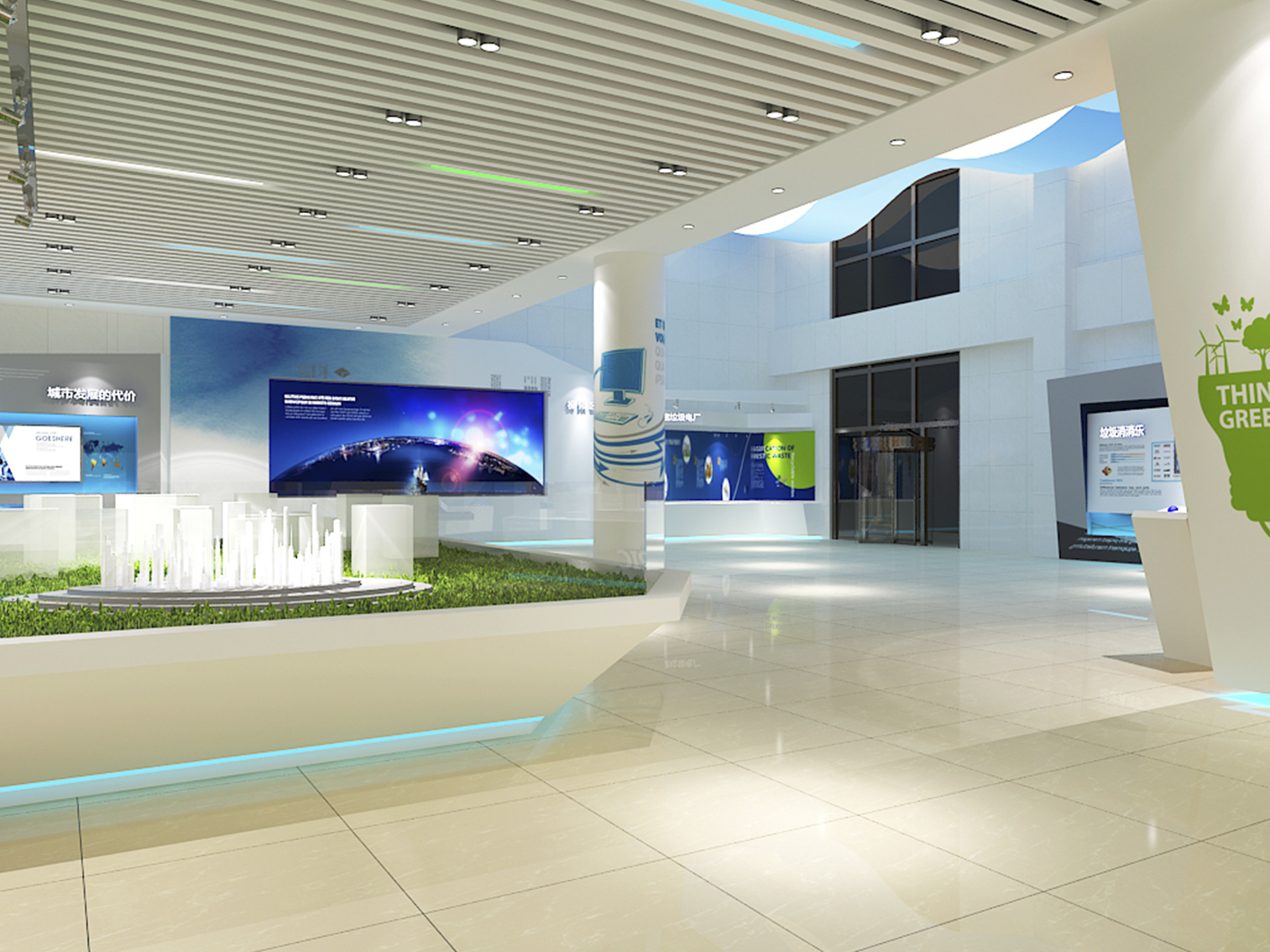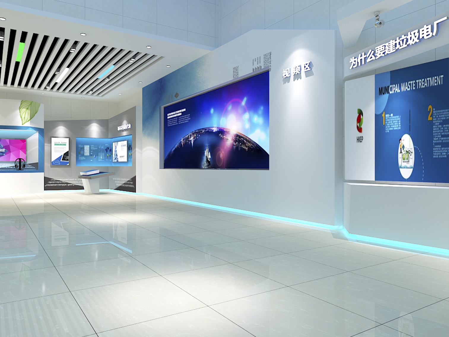 受中國電力新能源發(fā)展有限公司委托,本展廳設(shè)計采用藍(lán)綠配色作為主色調(diào)突出了綠色環(huán)保這一主題,上百塊展板也做到了風(fēng)格的完整統(tǒng)一。