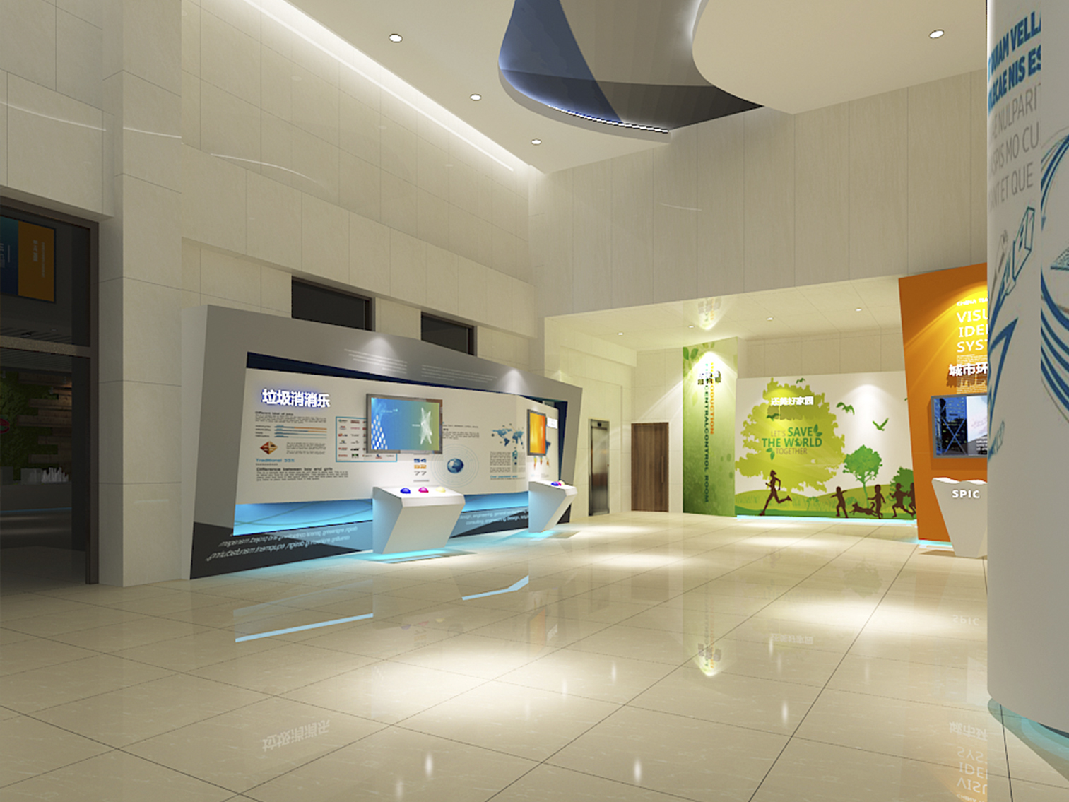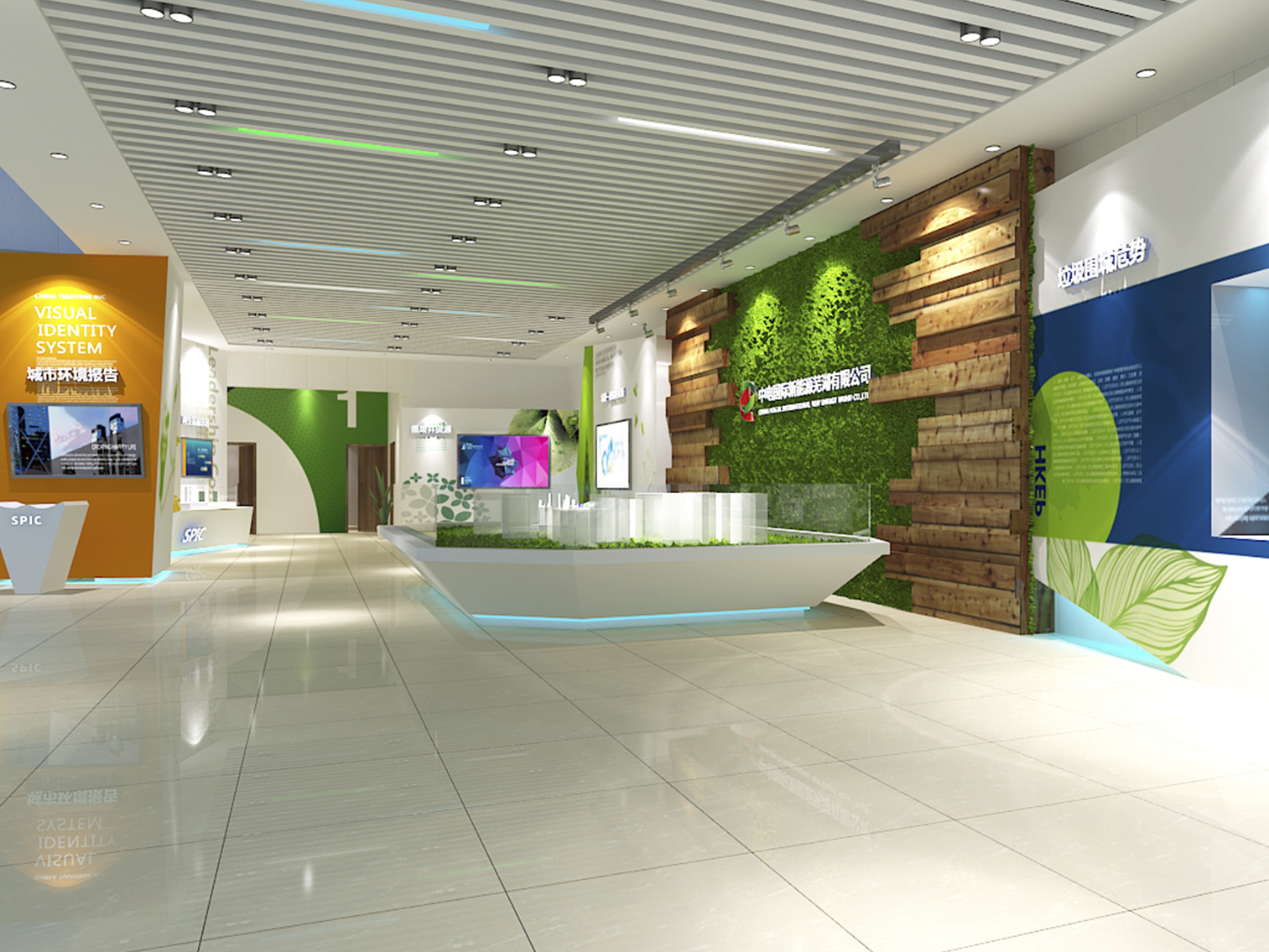 受中國電力新能源發(fā)展有限公司委托,本展廳設(shè)計采用藍(lán)綠配色作為主色調(diào)突出了綠色環(huán)保這一主題,上百塊展板也做到了風(fēng)格的完整統(tǒng)一。