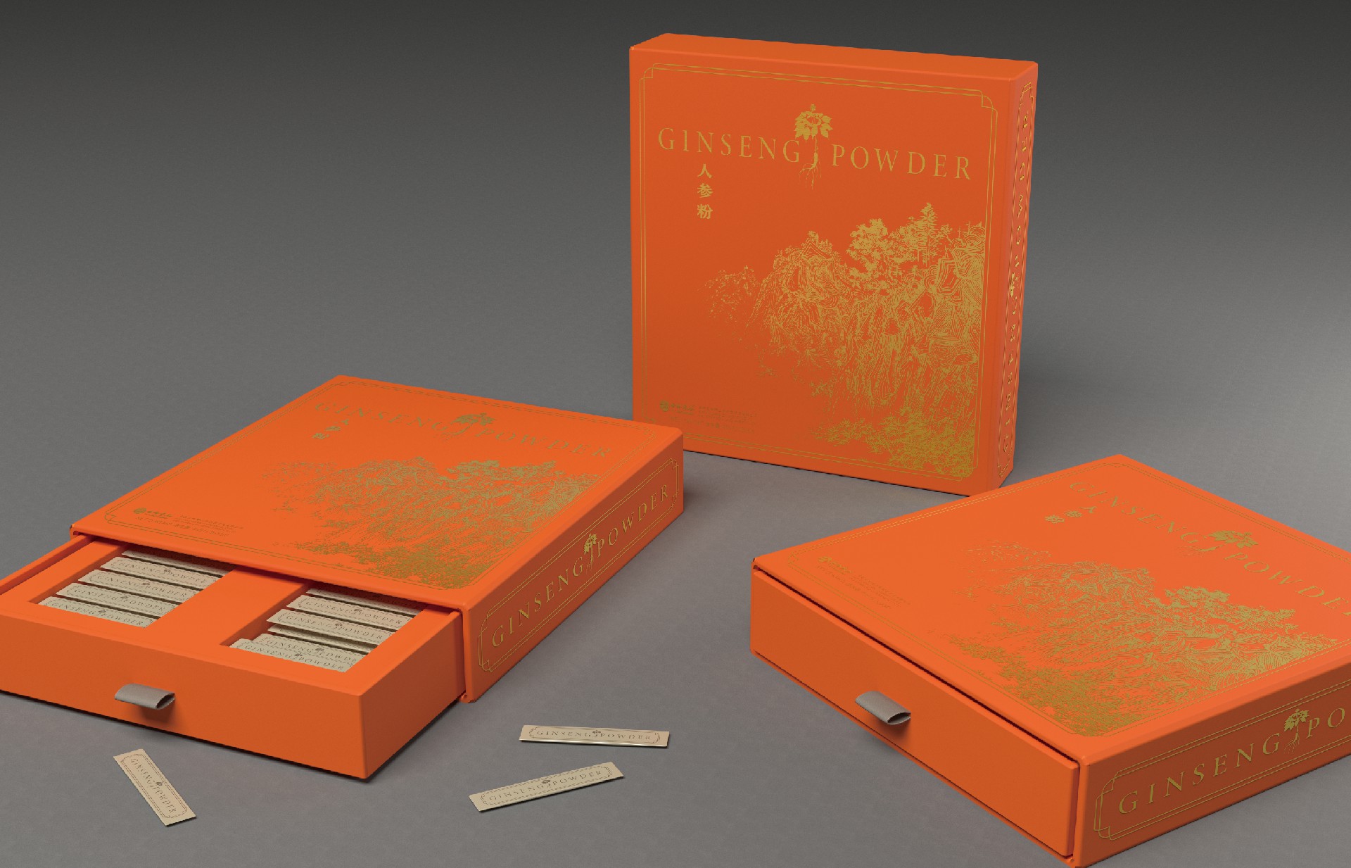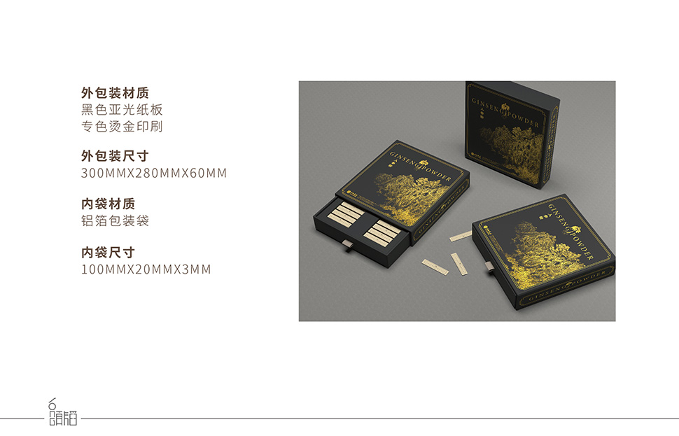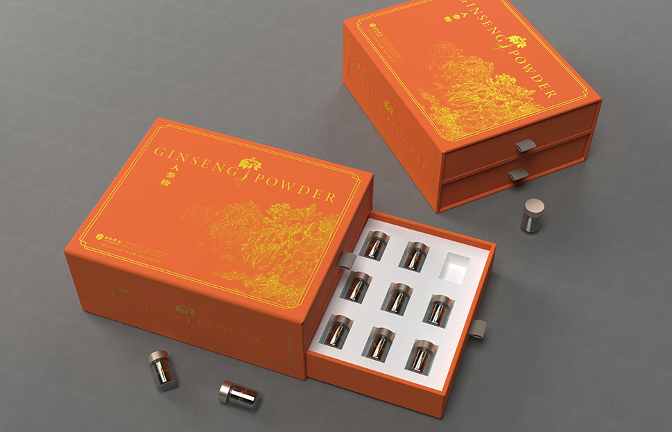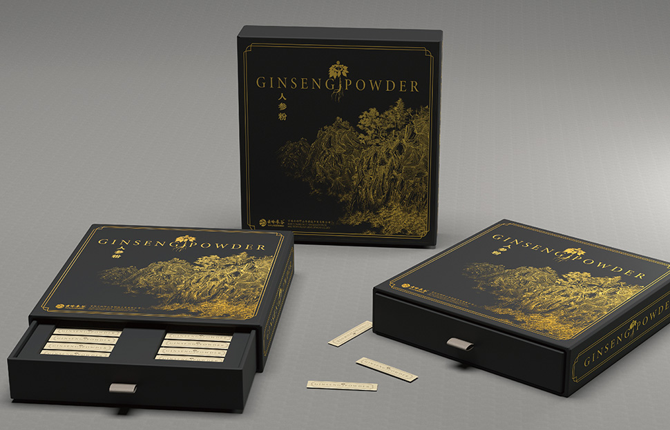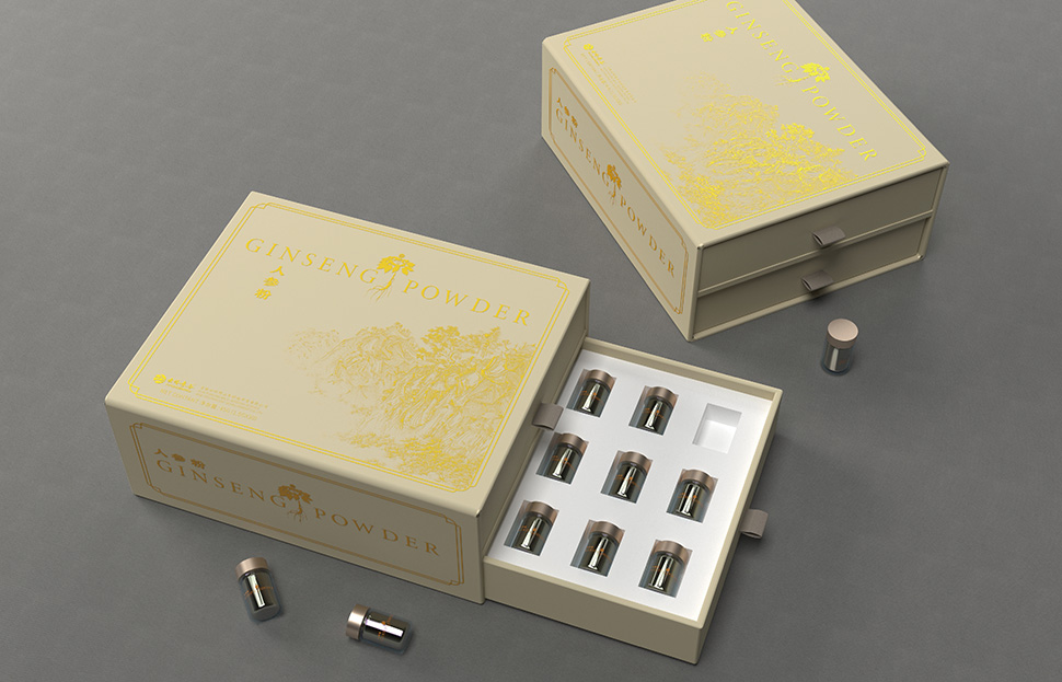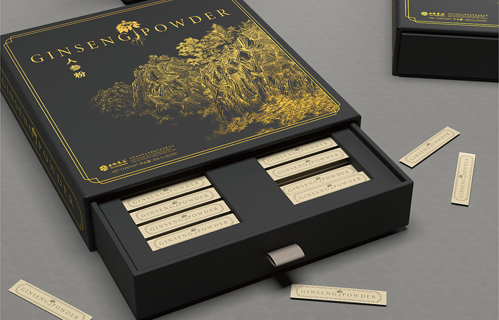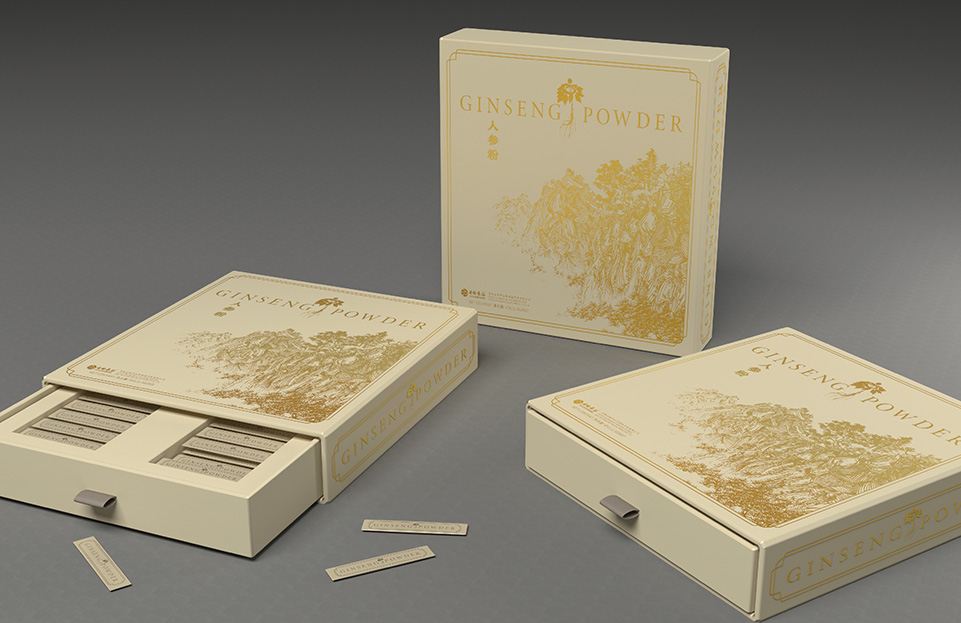 云嶺野山參粉需要出口美國、日本等八個國家,設計文案以英文作為主漢字標注,圖案采用國畫風格山林凸顯中國風同時也表明了產(chǎn)品的產(chǎn)地特征,采用燙金印刷工藝凸顯產(chǎn)品的高端檔次。